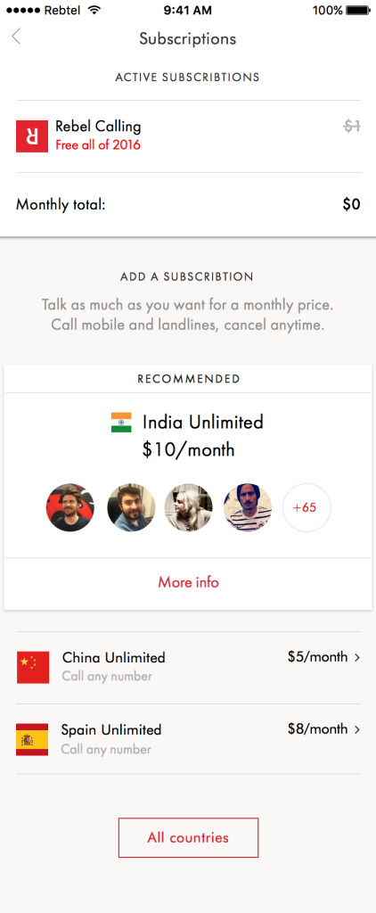 För 1 USD i månaden möjliggör nya Rebel Calling kostnadsfria obegränsade samtal internationellt. Tjänsten fungerar vid lansering i mer än 50 länder världen över och ambitionen är att fortsätta bryta ner internationella telekomgränser och fortsätta utmana höga samtalsavgifter.
